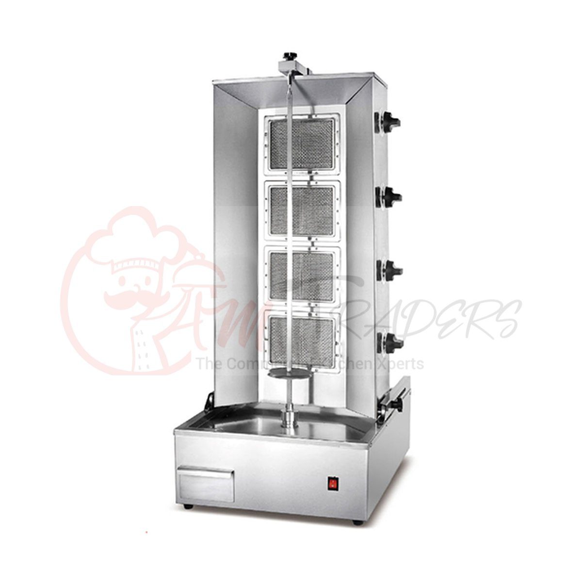 A shawarma machine, also known as a vertical broiler or gyro machine, is a specialized cooking apparatus designed for preparing shawarma, a popular Middle Eastern street food. The machine typically consists of a vertical rotating spit or skewer where layers of marinated meat, often lamb, chicken, or beef, are stacked and then cooked as they rotate.